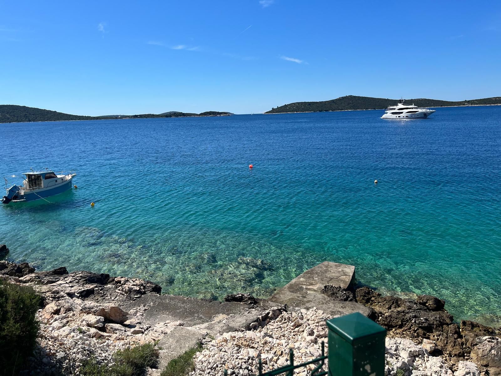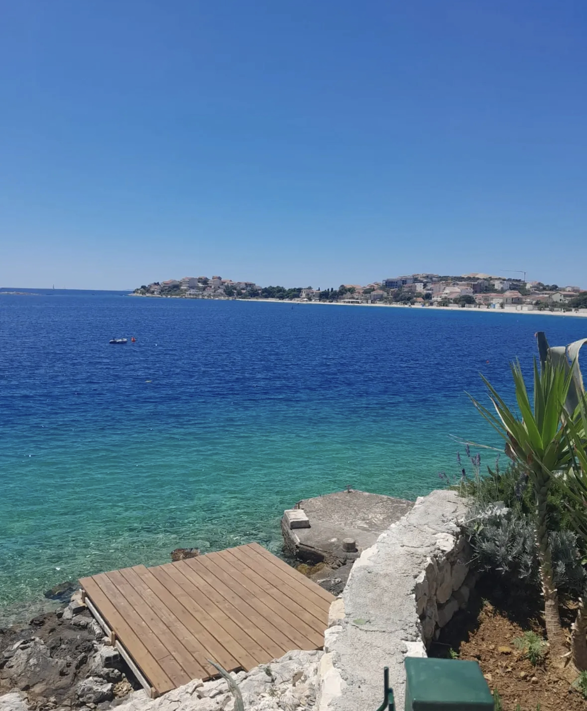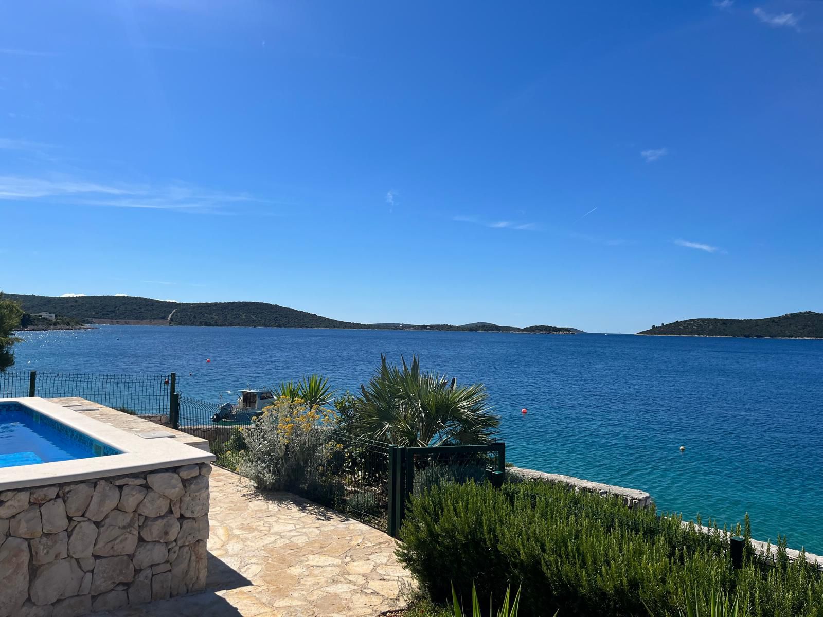 Yes, the villa features a private beach directly in front, with a wooden platform and steps for easy access to the sea. Guests also have access to a mooring for smaller boats, as well as a buoy for docking.